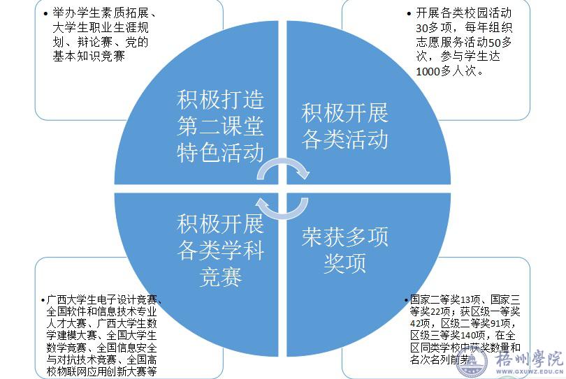 建立实习、就业基地,扩大就业渠道。目前,我院在梧州及周边地区实践教学基地30个。在深圳、东莞、广州等沿海地区建立实习就业基地,特别是与中关村软件园签订协议,进行本科生的联合培养。每年的就业率达到了学校的要求,并保持排在7个学院的前列。
