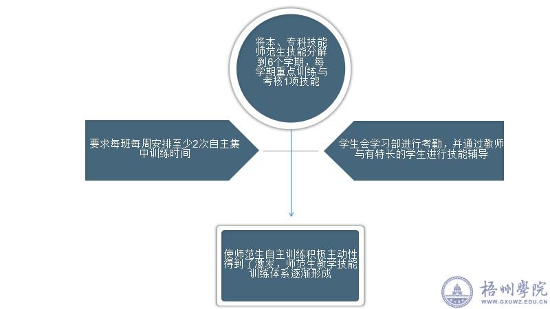 “十二五”期间,建立了适应高校培养师范生技能的独特师范生教学技能训练与考核体系,组织班级训练,相关部门、老师和学生对其进行考勤辅导,使教学技能训练与考核体系逐渐形成。