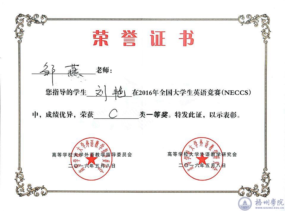 邹燕在2016年全国英语竞赛中获得一等奖指导教师。