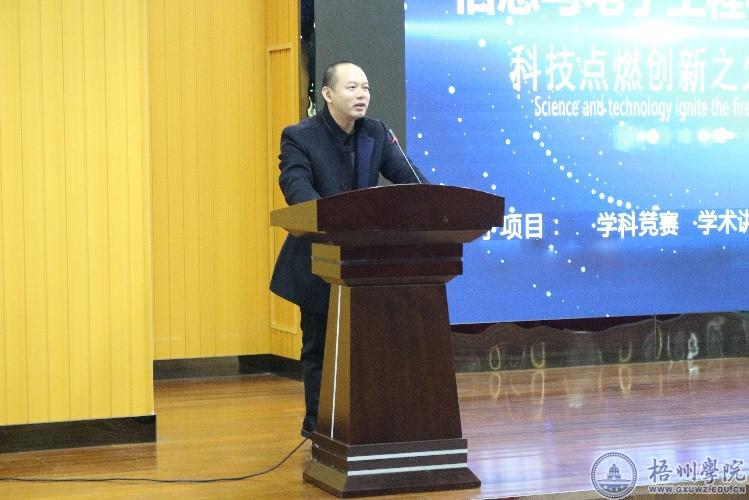 首先,全体师生共同观看信电学院第一届科技文化节宣传视频,视频中精彩展示了我院学生在近年来参加各类大赛的优秀作品。接着,来自14软件工程专业的何志明同学向大家分享他的科研创新事迹。随后,郭慧副院长向全体师生介绍了我院学生近年来参加各类学科竞赛获得的成绩,并鼓励同学们要勇于参与科研创作。最后,甘金明副校长做重要讲话,他表示培养学生科技创新素质一直是我院人才培养目标的重要内容,科技文化节不仅是一个展示师生魅力与才干的舞台,更是师生相互探讨、共同提高的平台,希望全院师生能积极参与,共同塑造良好的科研创新气氛。