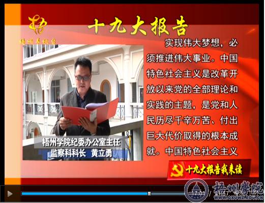 12月4日,在梧州电视台晚间新闻栏目播出的“十九大报告我来读”内容中,播送了我校纪委办公室主任、监察科科长黄立勇,经济管理学院物流管理专业教研室主任张晓磊,师范学院学前教育专业教师罗叶琦等积极参与诵读党的十九大报告内容。