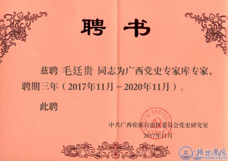 近日,自治区党委党史研究室根据我区党史工作发展需要,决定聘请区内35位同志成为广西党史专家库第一批专家,聘期3年。专家库成员均为来自全区各市、各高等院校对党史研究颇有成果和影响力的学者和科研人员,其中我校毛廷贵同志作为梧州市首位入选广西党史专家库的专家,也是梧州市本次入选的唯一一位专家。