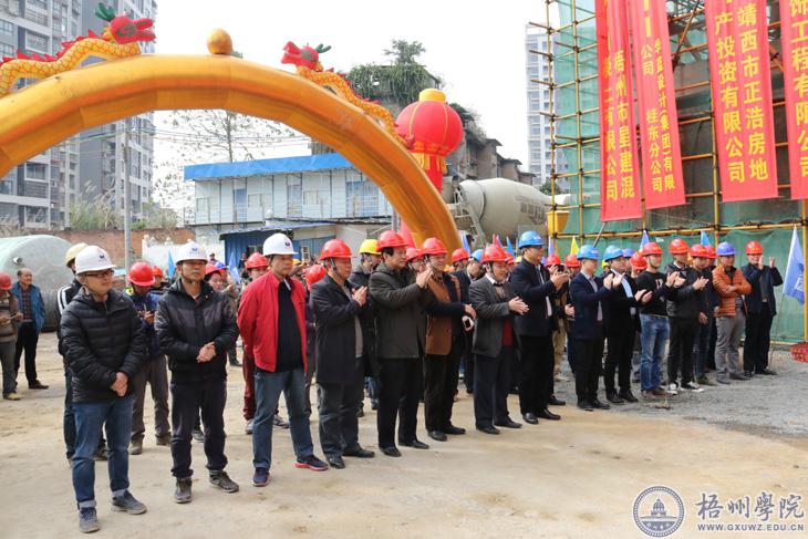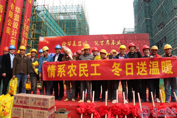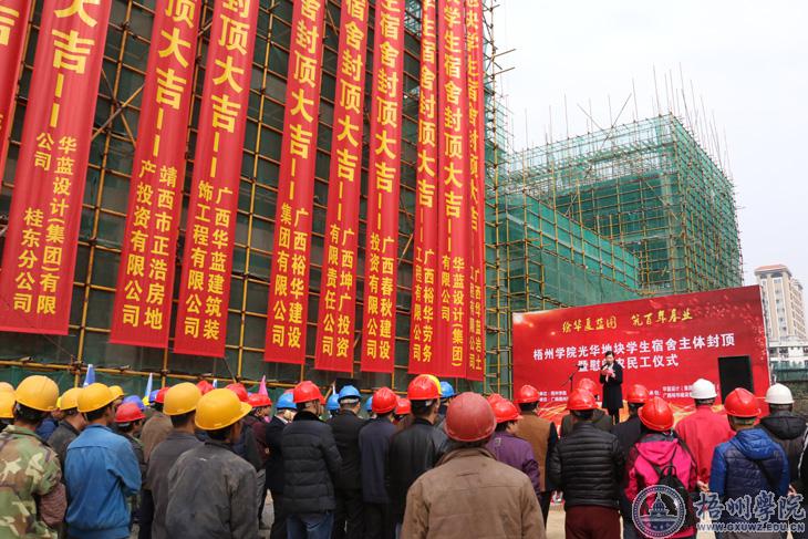 1月15日上午10时许,光华学生宿舍工地现场礼炮齐鸣,掌声雷动……梧州学院光华学生宿舍主体封顶暨慰问农民工仪式在工地现场举行。学校领导,项目开发商、施工方企业领导们共同启动铲砼吊运仪式,随着最后一铲混凝土吊运成功,该项目主体顺利封顶!这是学校贯彻落实第三次党代会、扎实落实五年目标的重要体现,也是吹响“基础设施建设攻坚战”的嘹亮号角。