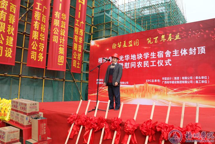 学校副校长玉振明,广西梧州建设监理有限公司副总经理周献兴,华蓝设计(集团)有限公司副总经理邓勇杰,广西裕华建设集团有限公司工程部副总经理黄琨昌以及学校综合管理处、重点办等部门负责人,各参建单位的领导、工人代表出席了活动。