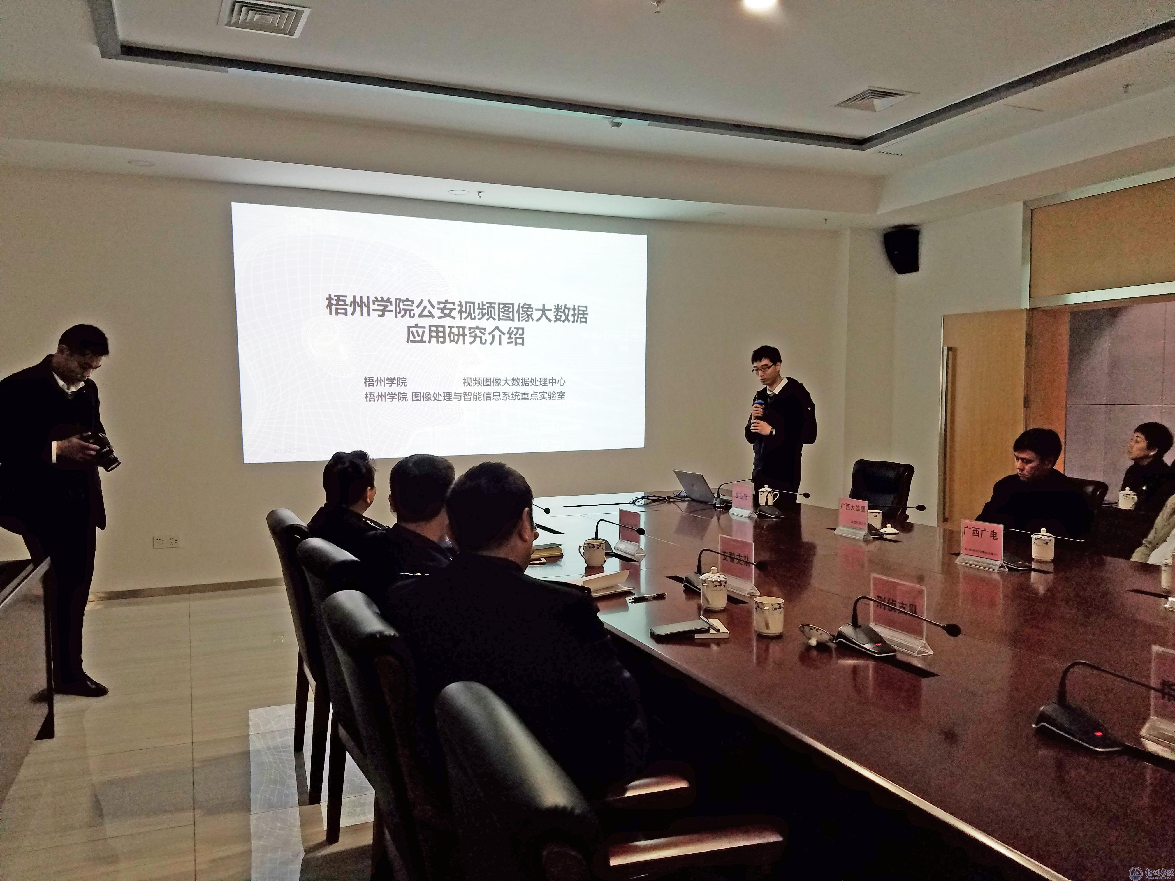 在“智慧警务 科技引领――警、校、企合作”研讨会上,信电学院卢在盛老师代表我校围绕与梧州市公安局合作的项目“梧州市公安视频图像大数据分析处理平台建设与关键技术研发”进行了汇报,项目旨在建立梧州市公安局与梧州学院之间的合作互动机制,建设成梧州市公安视频图像大数据分析处理平台,深度挖掘和利用梧州市“天网”监控视频信息;提高梧州市公安机关的稳控能力和打击罪犯水平。通过研发,解决无牌车辆、套牌车辆难以视频监控监管等问题。通过对刑侦采集到的成像质量差的视频和图像数据进行分析处理,提高梧州市公安局图侦技术的应用水平。