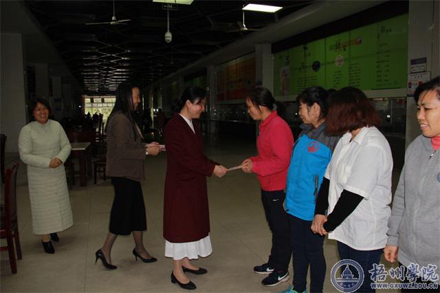 在2018年“三八妇女节”来临之际,3月7日下午,学校党委副书记曹迎带队到第一食堂看望并慰问了困难女职工,为她们送上学校的关怀和节日的问候与祝福,并送上了慰问金。校女工委、综合管理处负责人参加了本次慰问活动。