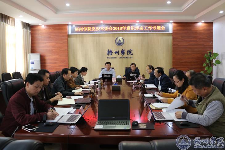 会议审议了学校2018年意识形态工作会议的主要议程、审定了《梧州学院党委落实意识形态工作主体责任责任书》。会议认为意识形态安全是国家安全的关键层次,高校是意识形态工作的前沿阵地,要深刻领会习近平总书记有关意识形态工作的讲话精神,充分认识意识形态工作的极端重要性。当今世界各种思想文化相互渗透影响、交流交融交锋异常频繁,对高校意识形态工作提出了新课题新挑战。当前,要把学习贯彻落实全国高校思想政治工作会议精神作为一项重大政治任务。对于学校意识形态工作,必须准确研判问题,保持清醒的政治定力,牢牢把握党对学校意识形态工作的主动权。