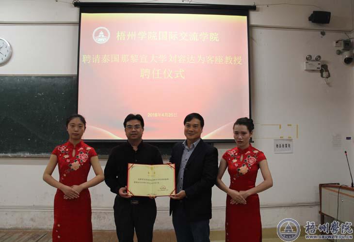 4月25日下午,我校国际交流学院在明理楼S404举行聘任仪式,聘请泰国那黎宣大学刘容达教授为我校客座教授。国际交流学院院长、国际交流处处长刘卫东为刘容达教授颁发了聘书。