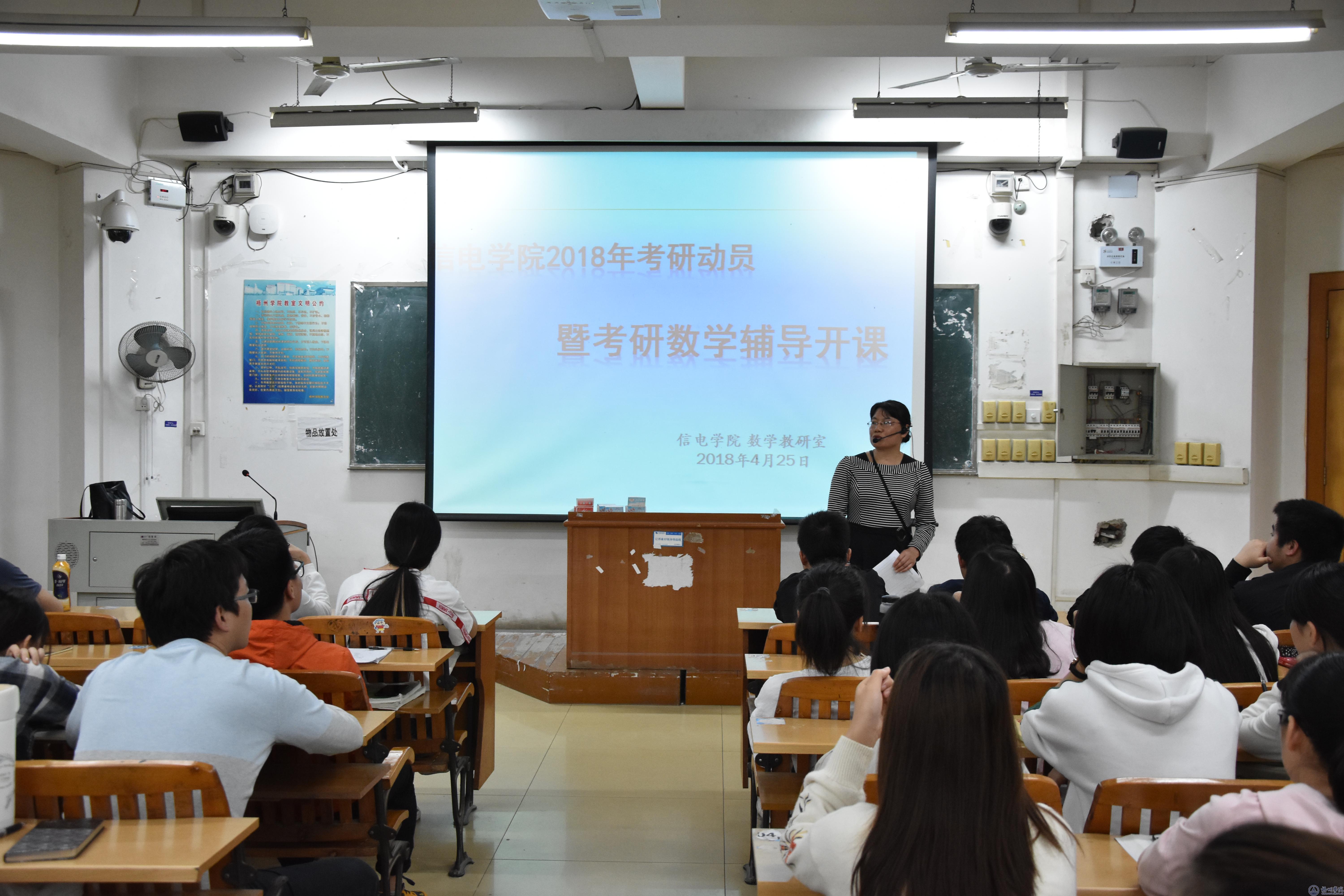 4月25日下午,信电学院在明理楼S303教室召开考研动员暨考研数学辅导开课大会。高等数学课程教研室主任苏芳及意向考研学生100余人参加此次大会。