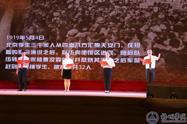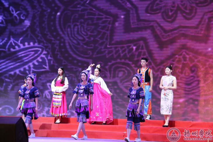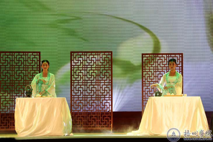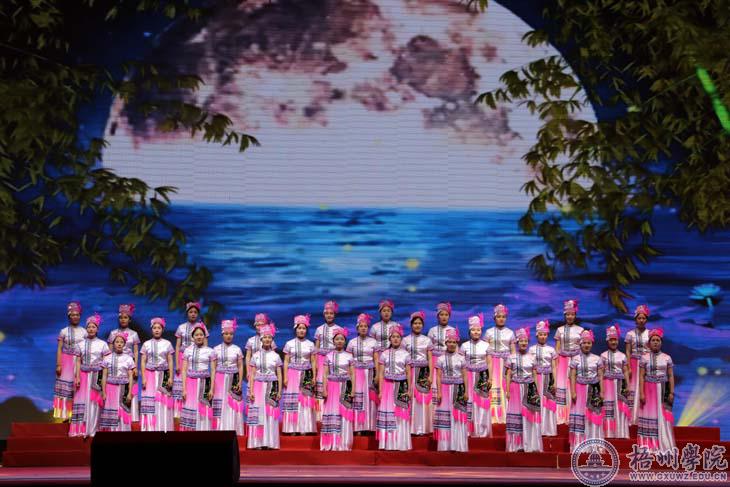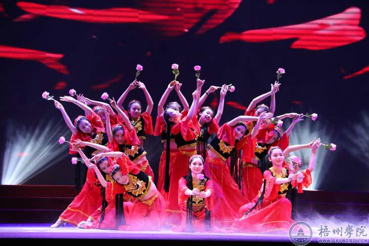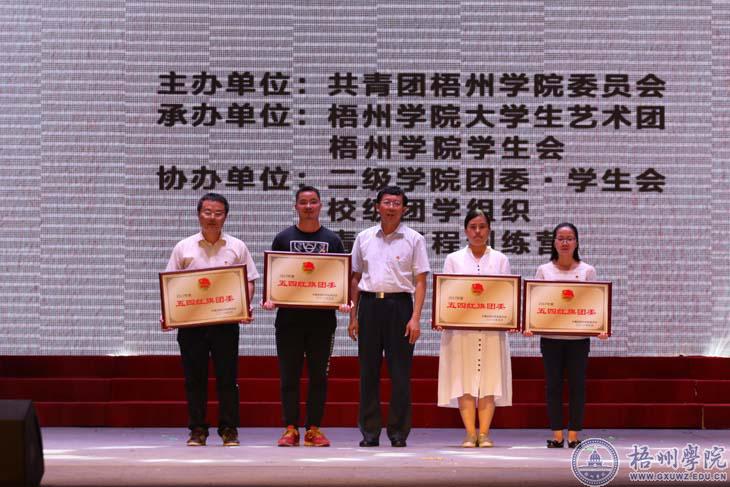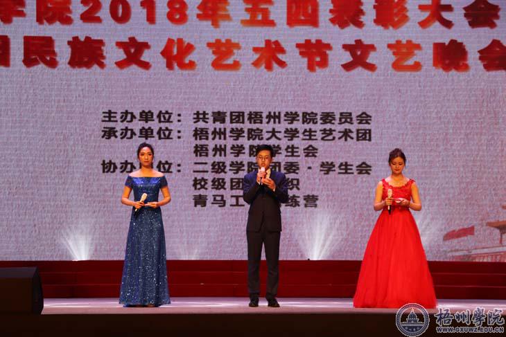 晚会的节目结合五四精神和校园民族文化艺术的特点,向在场的观众展示梧州学院大学生的青年风貌及艺术成果。大学生艺术团合唱队一曲中国共产党青年团团歌《光荣啊,中国共青团》揭开晚会的序幕。艺术团舞蹈队带来舞蹈《送你一朵玫瑰花》、全国获奖节目《走呦走呦》,极具民族特色的合唱《崴萨啰》及小组唱《爱在天地间》,服装走秀《民族华裳》,向观众展示苗族、傣族、藏族等具有特色的民族服饰,茶艺《致青春一杯茶》传播茶文化;我校青年教师带来朗诵《青春中国》;萧韶诵读社带来情景朗诵《钢铁》。