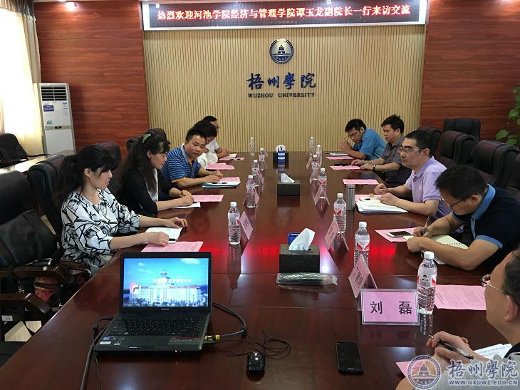5月15日上午,河池学院经济与管理学院副院长谭玉龙一行5人来我校考察市场营销、旅游管理等本科专业建设情况,并就专业建设、人才培养方案制定等相关事宜进行座谈交流。经济管理学院副院长(主持工作)杨西春、旅游管理教研室和市场营销教研室主任以及工商管理、国际贸易、公共管理专业教师参加了交流座谈会。