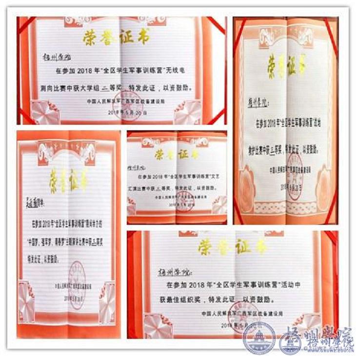 在这一周的军旅体验中,我校代表队克服天气炎热等诸多困难,发扬“掉皮掉肉不掉队,流血流汗不流泪”的革命精神,在本次参赛的18只队伍中脱颖而出,在众多项目上都取得不俗成绩:无线电测向项目大学组二等奖,战地救护项目三等奖,文艺汇演三等奖。我校学生吴雨薇在训练营“中国梦、强军梦、青春梦”演讲比赛中获得三等奖,梧州学院荣获“全区军事训练营”最佳组织奖。