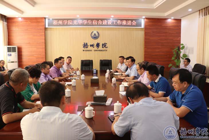 | 为了加快光华学生宿舍工程建设进度,2018年5月21日下午,在明理楼第二会议室,学校召开了梧州学院光华学生宿舍建设工程推进会,约谈了该工程施工单位负责人及相关人员。项目EPC总承包商华蓝设计(集团)有限公司总经理钟毅等一行9人参加会议,其中包括工程承建商裕华公司代表和工地管理人员,参加会议的还有工程监理方代表。我校领导党委书记唐平秋、副校长玉振明、纪委书记梁业华出席会议。