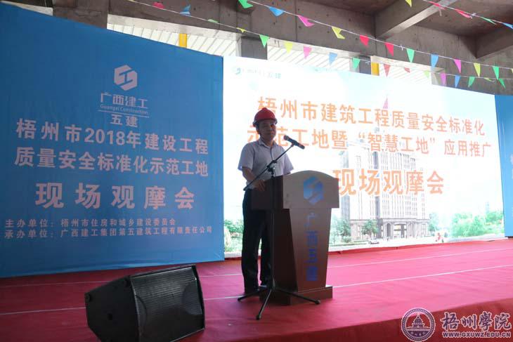 6月5日,2018年梧州市建筑质量安全标准化示范工地现场观摩会在我校科技大楼建筑工地召开,我校科技大楼承建方广西建工五建承办了会议。梧州市住房和城乡建设委员会党组副书记吕义杰,学校副校长、基建攻坚指挥部指挥长玉振明,学校校长助理、基建攻坚指挥部副指挥长覃雄彪及基建攻坚指挥部有关领导出席会议。梧州市7个县市区住建局有关领导和7个县市区全部在建项目负责人等200多人参加了现场观摩会。玉振明副校长代表学校致欢迎辞。
