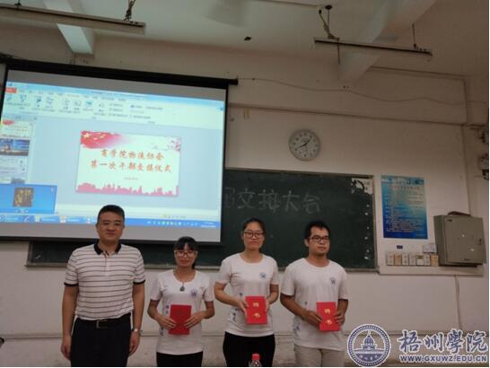 张晓磊老师在会上公布了通过综合考核的协会新一批干部成员名单。紧接着,新老干部进行交接仪式,老干部为新干部戴上干部牌,每一块干部牌都寄托着上一届干部对新一届干部的期望。在热烈、祥和的氛围中,物流管理教研室的四位老师为管理干部颁发聘书。