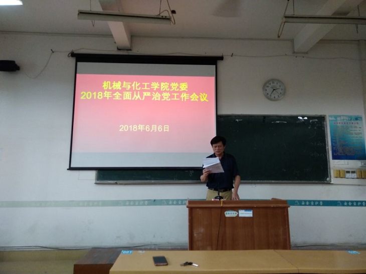 6月6日下午,机械与化工学院党委在明理理惑楼S201室召开2018年全面从严治党工作会议。党委书记陈金辉代表党委作了题为《全面从严治党 推动学院党建工作向纵深发展》的报告。学院全体师生党员参加了会议。