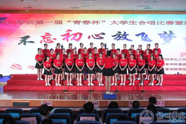 比赛在2017年十佳歌手冠军王意诚同学演唱的一首《让我留在你的身边》中拉开序幕。比赛中同学们以饱满的热情、嘹亮的歌声深情演绎了《青春飞翔》《唱支山歌给党听》《半个月亮爬上来》等立意鲜明的歌曲,展现了梧州学院莘莘学子积极向上、励志图强的精神风貌。14支参赛队伍的表现精彩绝伦,参赛同学们着装统一,神情从容自信,歌声和谐悠扬。他们纵情高歌,唱响专属青春的梦想与旋律,唱出了新时代青年对党、对祖国的浓厚深情和热情,歌声催人奋进,气势振奋人心。