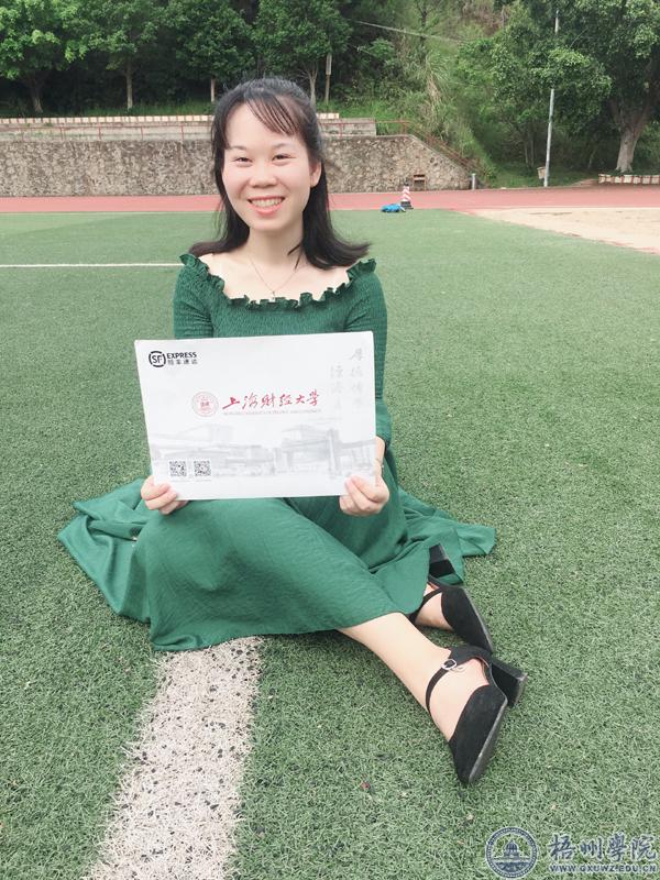 | 历时11个多月,收到来自上海财经大学的研究生录取通知书的2014级对外汉语中英班的刘莹,戴着一副黑框眼镜,扎着马尾,穿着刚新买不久的裙子,手拿录取通知书在学校的足球场上拍下了与通知书的合影,脸上洋溢着喜悦。