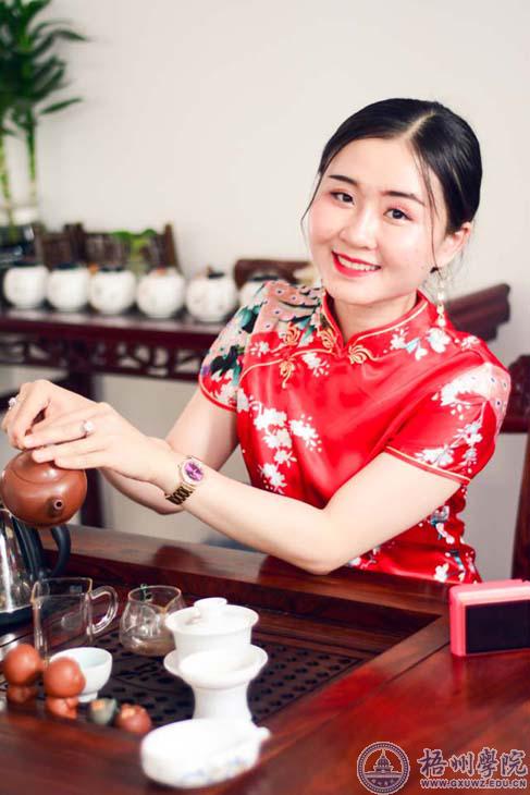 大益茶室内,宋云丽身着一袭花色旗袍坐在茶几前手持红木制成的茶匙轻轻舀几片茶叶放入茶壶,再将沸水注入壶中,捧杯沏茶,蒸汽携着茶香袅袅上升,宛如一幅古色古香的佳人图……宋云丽非常热衷于泡茶,这是她来到梧院学习到的一门新手艺。