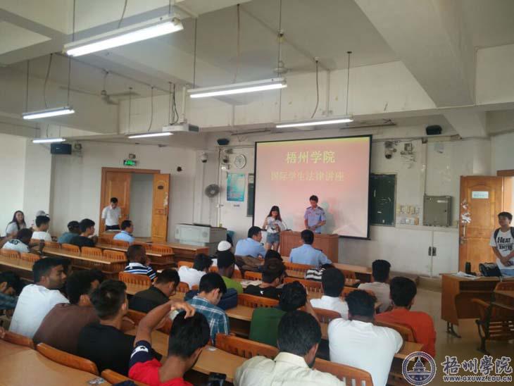 6月22日上午,我校邀请梧州市公安局交警支队、出入境管理支队、富民派出所来到学校国际交流处对150多个外籍学生进行道路交通安全和有关护照签证方面的教育讲座。国交处全体人员参加了这次讲座。讲座中,交警、派出所民警向同学们介绍了目前的道路交通安全现状,有针对性地梳理存在的较为突出的交通安全隐患问题;出入境管理支队民警结合《中华人民共和国外国人入境出境管理法》,就外国人入境居留许可的办理要求、更换护照信息的注意事项、非法居留、非法就业、住宿登记等与留学生和外籍教师密切相关的问题进行了细则宣讲,并对涉外管理人员进行了业务知识培训。