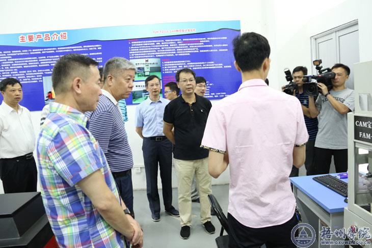 专家组在孵化基地一楼首先参观了我校与鸿源制造设备有限公司合作研发的“数控升降宝石机”“自动宝石刻磨机”等产品,现场听取研发人员的详细介绍,对我校的科研成果和转化给予了高度赞赏。在“梧州市3D打印医学应用中心”里,专家组观摩我校与市红会医院合作的医学3D打印应用成果。