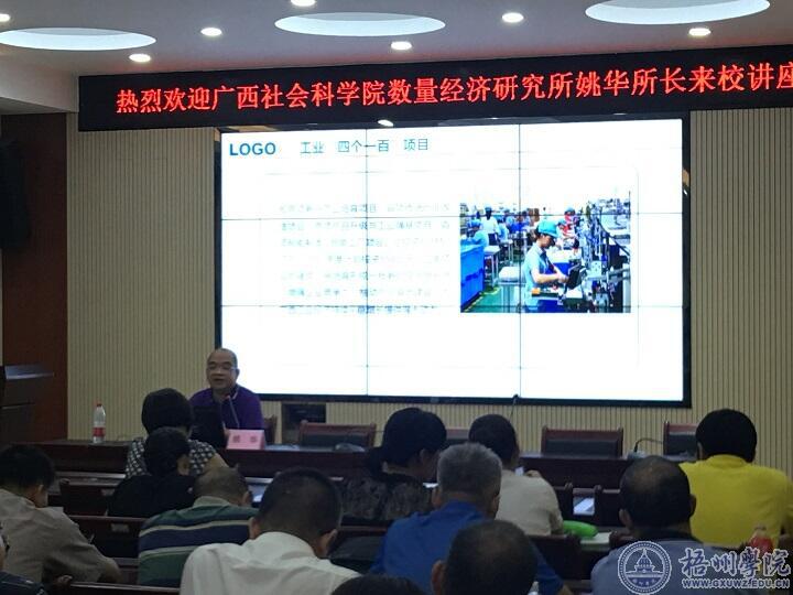 近日,商学院邀请广西社科院数量经济研究所所长姚华在明理楼七楼视频会议室作题为《广西宏观经济形势分析与展望》的学术讲座。讲座由商学院院长杨西春教授主持,学院领导班子成员及全体教师参加了讲座。