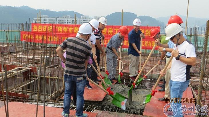 7月12日上午,我校举行梧州市教师公共租赁房主体封顶仪式。我校基建攻坚指挥部、后勤基建处领导和廉江市第一建筑工程有限公司负责人等共同启动铲砼仪式,标志着该工程主体顺利封顶。