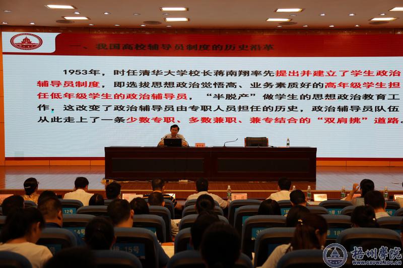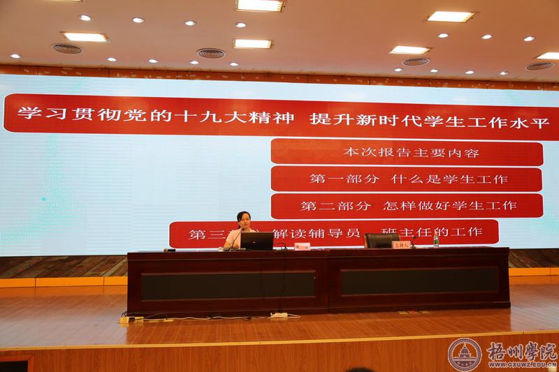 曹迎副书记以“学习贯彻党的十九大精神 提升新时代学生工作水平”为主题作了专题报告,围绕“什么是学生工作,如何做好学生工作,辅导员(班主任)工作”,提出了新时代学生工作必须以习近平新时代中国特色社会主义思想为指导,准确把握内涵,开创新时代高校学生工作新局面;必须围绕立德树人根本任务,把以本为本、“四个回归”作为学生工作的重要遵循,探寻高校学生工作规律,因事而化、因时而进、因势而新;必须加强自身建设,提升学生工作水平,写好新时代梧州学院学生工作的“奋进之笔”。