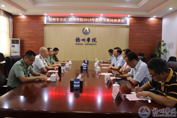 9月6日上午,在第34个教师节来临之际,梧州市委常委、梧州军分区司令员张汉川率队到我校开展教师节慰问活动,代表驻梧部队官兵为学校全体教师送上节日的问候与祝福。学校领导唐平秋、曹迎与张汉川一行进行了座谈。