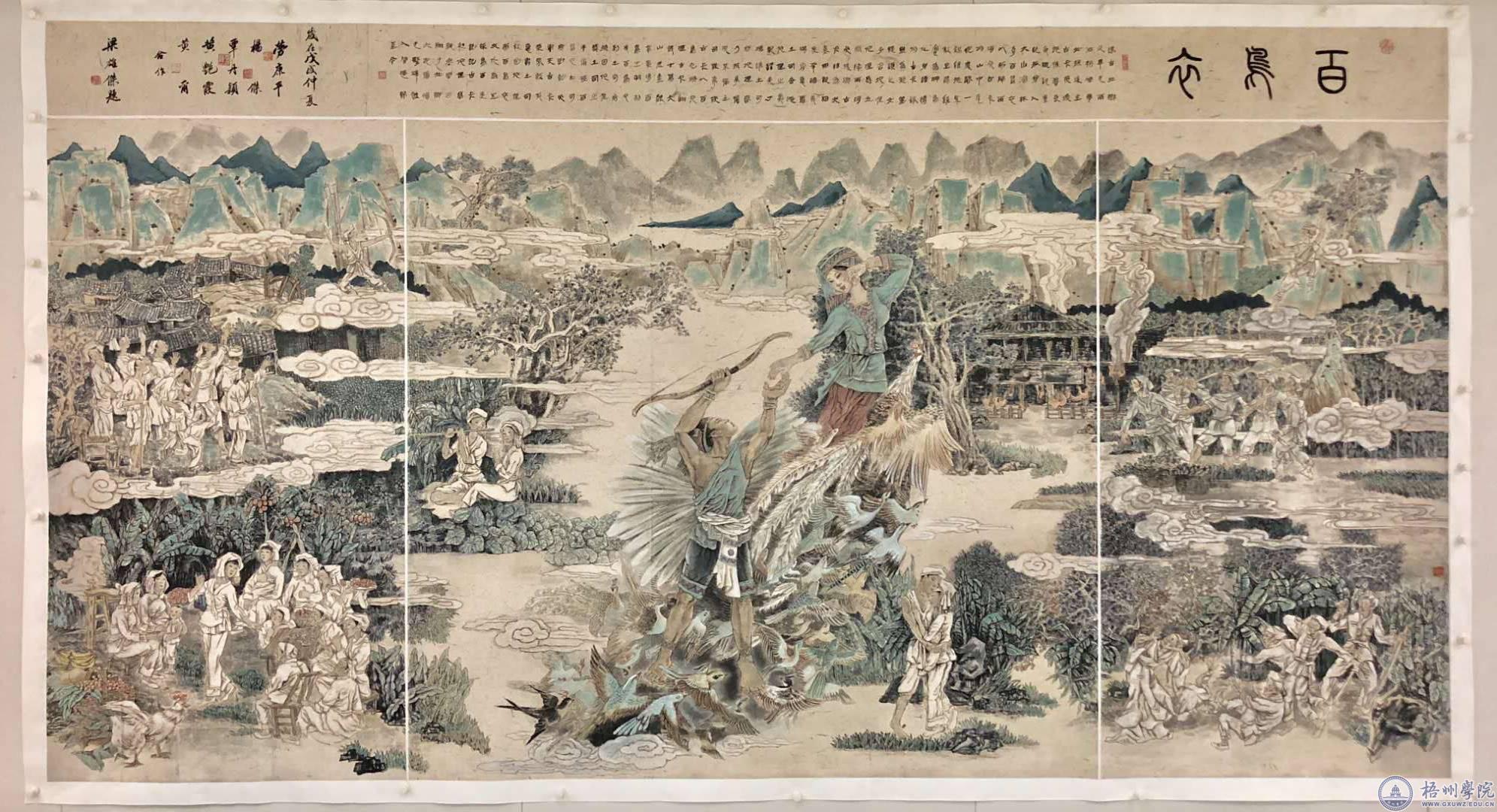 我校宝石与艺术设计学院教师杨杰、黄尔参与创作的壮族史诗《百鸟衣》(中国画),顺利通过了验收。据悉,在梧州市参与广西重大题材的美术创作中,由五人组成创作团队的《百鸟衣》项目乃是首创,具有里程碑的意义。