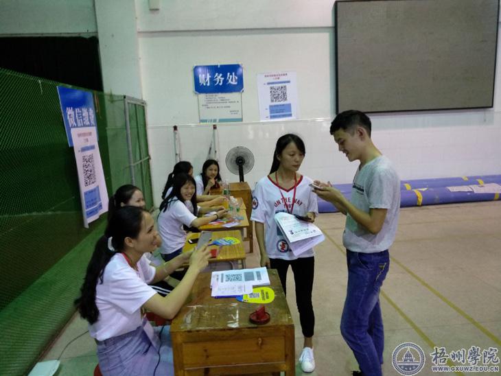 财务处处长梁荔介绍,在学校印发的录取通知书内已经详细告知新生各个二级学院的银行卡账号和关注并进入梧州学院微信公众号进行网上缴费。新生们可以到本地的各个银行进行转账缴费或者选择通过进入微信公众号,输入自己的学号和密码进行登录缴费,这样可以在来校之前完成缴费,十分方便快捷。据财务处统计,已有40%左右的新生在来学校之前就已采用线上支付的方式完成缴费。