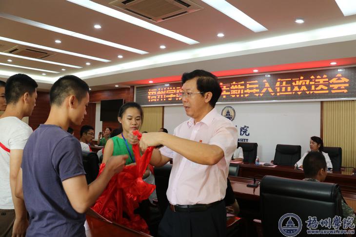 首先由学校党委副书记曹迎宣读在校应征入伍新兵名单,学校党委书记唐平秋则为入伍新兵戴上红花并送上慰问金。