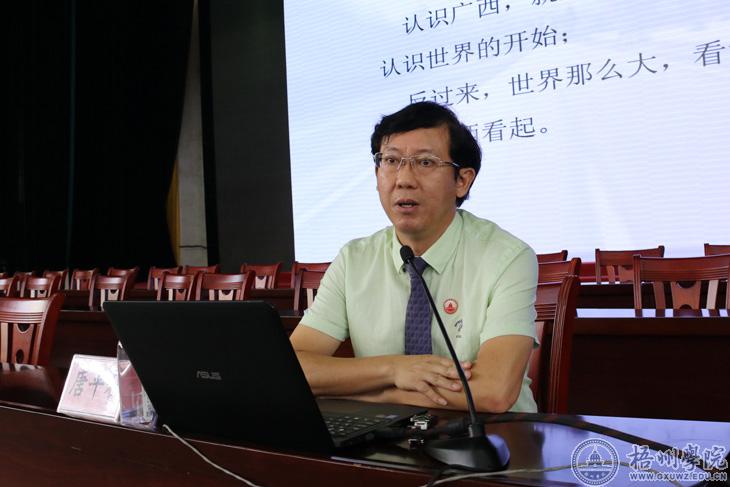 在与新生品味梧州文化时,唐平秋书记从读懂文化梧州、畅游山水梧州、传承红色梧州几个方面作了深入介绍。梧州是珠江中游的岭南文化古都,有着4100多年的文明史和2200年的建城史,是联结广西和广东的纽带,是岭南文化的发祥地。他结合梧州历史名人、文化遗址和驰名中外的美食品种,向大家展示了梧州鲜为人知的一面。