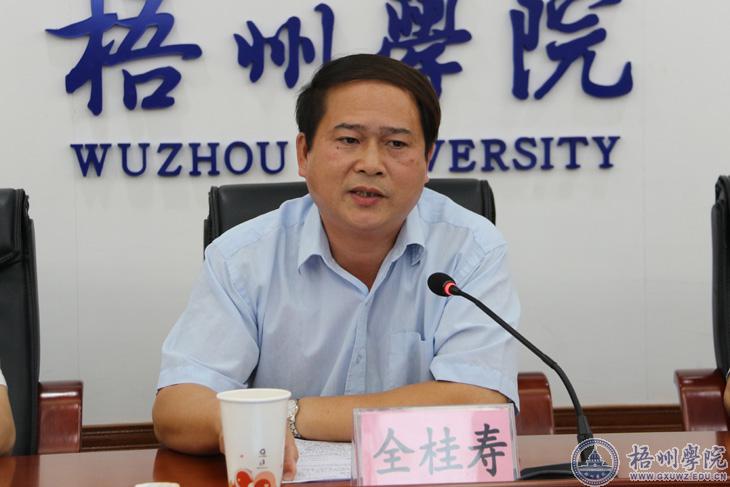 全桂寿对梧州学院一直以来对梧州市经济社会发展的大力支持和做出的积极贡献表示感谢。他指出,梧州学院的发展与梧州的发展紧密相连,市委、市政府历来重视和关心梧州学院的发展,希望学院与梧州市一起努力,同命运,共奋斗,努力朝着好的方向,发展得更有实力、更有活力、更有影响力。他要求,梧州学院一是要突出正确办学方向。教育是国之大计、党之大计,办好人民满意的高等教育必须系统回答和解决培养什么人、怎样培养人、为谁培养人这一根本问题,梧州学院要坚持把立德树人作为根本任务,旗帜鲜明地坚持社会主义办学方向,培养德智体美劳全面发展的社会主义建设者和接班人。二是要突出鲜明办学特色。要坚持办好六堡茶、宝石、制药工程等具有地方特色的学科和专业群,着力培育一批“梧字号”自治区级、国家级科研和创新平台。要建设一支高素质的教师队伍,提升现有特色品牌。三是要突出服务梧州发展。当前梧州市正毫不动摇实施“东融”战略,全面对接大湾区、深入融入珠三角、提升珠西经济带、建好广西东大门,对人才和科技的渴求十分迫切,梧州学院要发挥应有的责任,主动、紧密地与地方加强联系,结合地方发展需求,促进成果的转化和应用,在参与地方发展的实践中展示和检验教学成效。