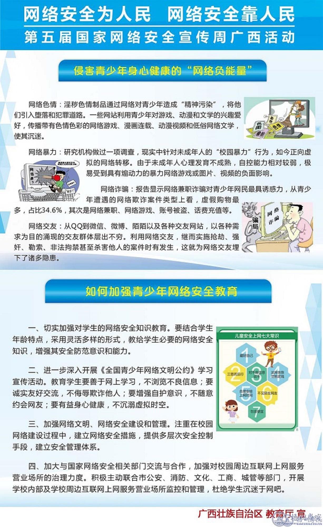 为加强我校师生网络安全宣传意识,学校网信办开展了国家网络安全宣传周广西活动宣传,列出网络安全提示。