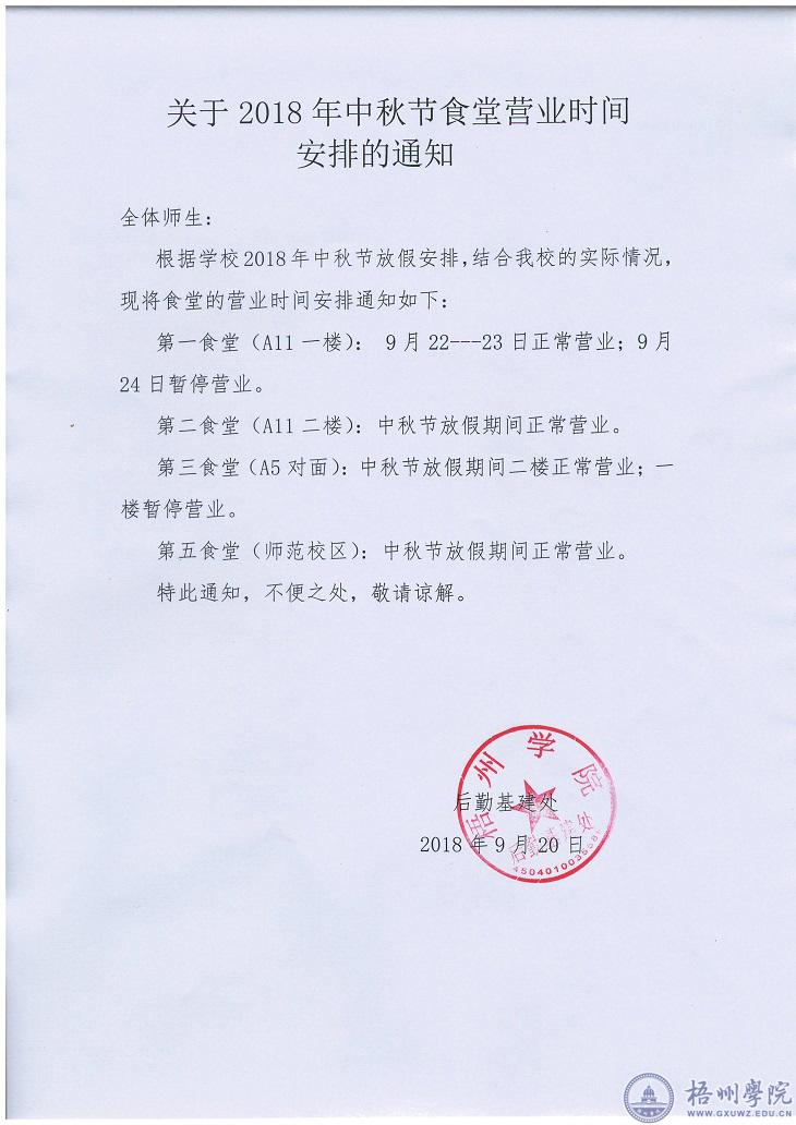 关于2018年中秋节食堂营业时间安排的通知