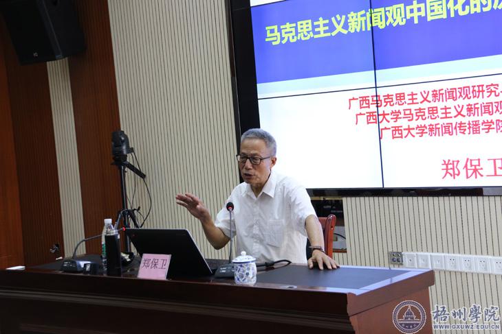 9月20日上午,广西部校共建新闻院(系)马克思主义新闻观主题巡讲活动在我校开讲,广西大学新闻传播学院院长、广西马克思主义新闻观研究与实践基地主任、中国人民大学博导郑保卫教授到我校以“马克思主义新闻观中国化的历史进程及理论贡献”为主题为师生作了专题讲座。学校党委副书记曹迎主持讲座。