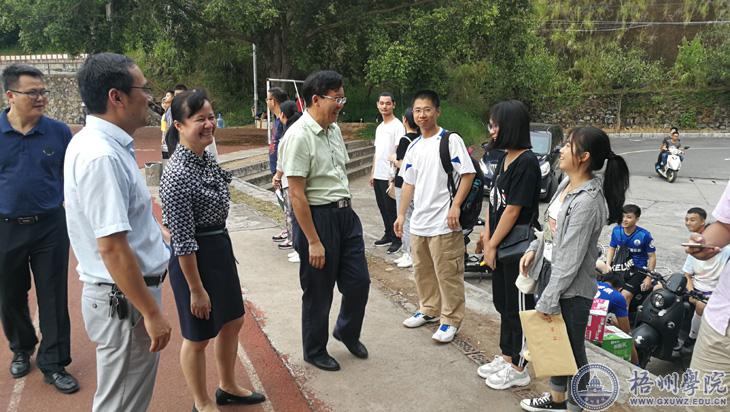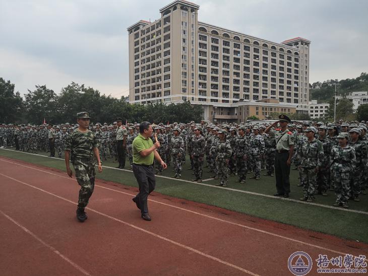军训会操大会上,梧州军分区领导在我校领导陪同下检阅新生军训团