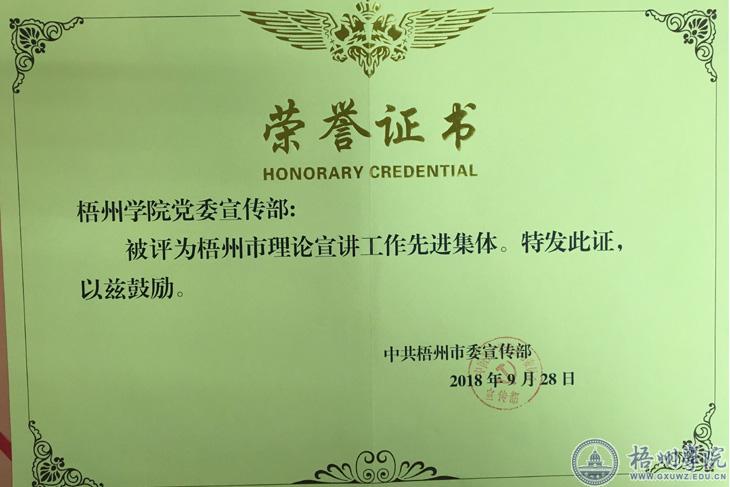 近日,在梧州市委宣传部组织的全市理论宣讲工作先进集体、先进个人和优秀宣讲报告表彰中,我校党委宣传部被评为先进集体、3名师教师被评为先进个人、一份报告被评为优秀宣讲报告。