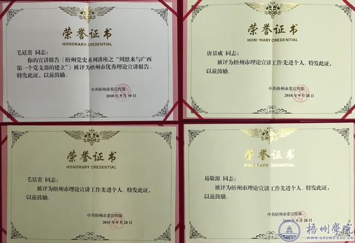 我校文学与传媒学院党总支书记毛廷贵、党委宣传部副部长唐景成、马克思主义学院教师易敬源被评为“先进个人”荣誉称号;毛廷贵的宣讲报告《梧州党史系列讲座之“周恩来与广西第一个党支部建立”》被评为优秀宣讲报告。