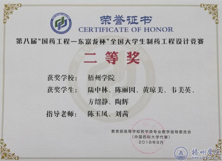 日前,由教育部高等学校药学类专业教学指导委员会主办、常州大学承办的第八届“国药工程-东富龙杯”全国大学生制药工程设计竞赛落下帷幕,我校制药工程专业2015级制药工程班的陆中林、韦美英、陈丽因、黄琼美和2016级制药工程方绍静和陶辉组成的佩兰队,最终通过竞赛组委会评审专家们严格评选,获得全国二等奖。