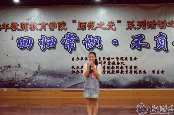 | 10月13日晚,教师教育学院在北区音乐厅举办了以“回归常识·不负韶华”为主题的“师范之光”系列活动之师范生演讲比赛,通过比赛提高了师范生的语言表达能力和综合素质,展示未来教师风采。学校团委书记李德华、教师教育学院院长谢龙华出席比赛活动。