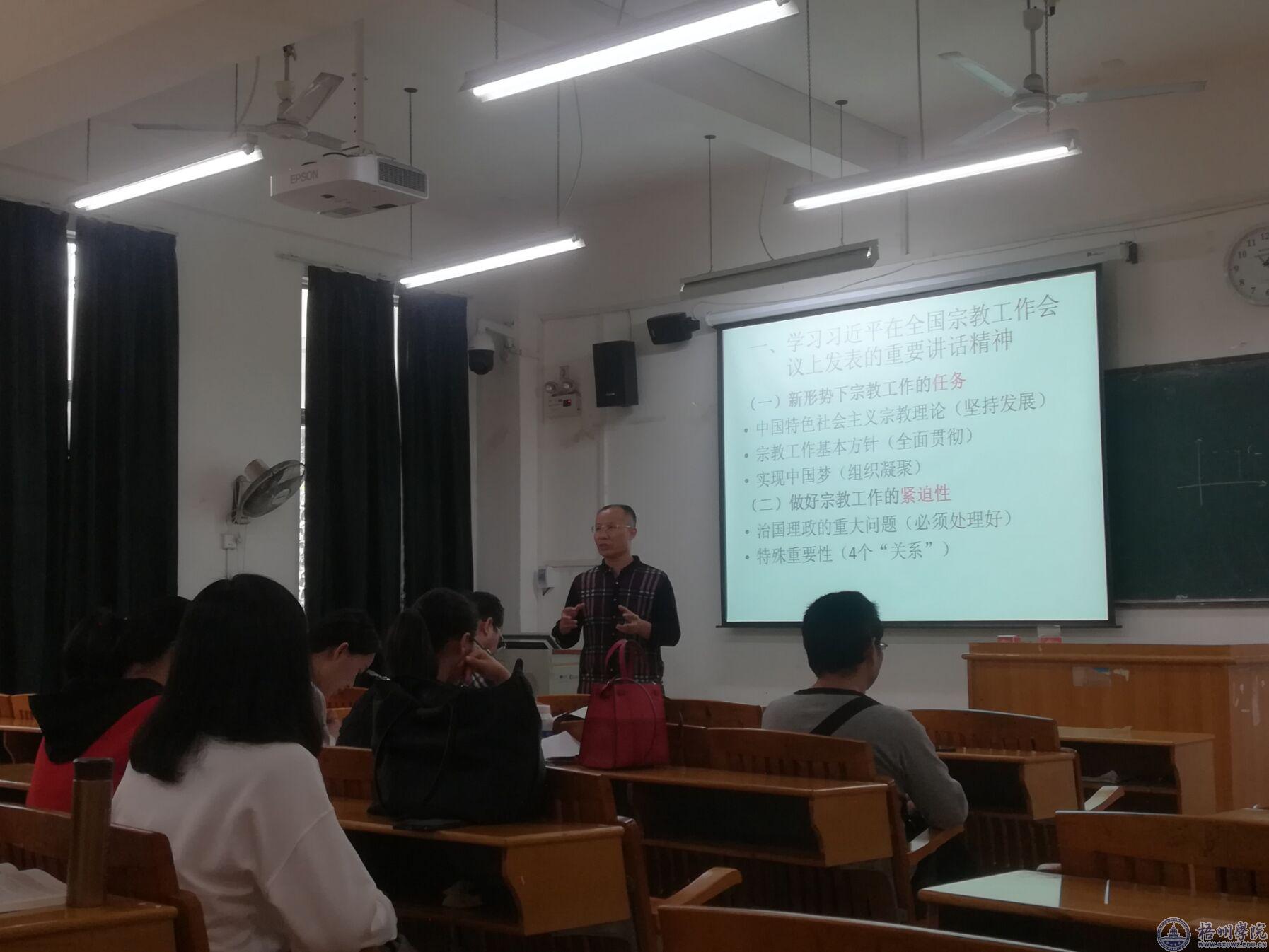 黎祖立首先带领大家学习习近平总书记在全国宗教工作会议上发表的重要讲话精神,对新形势下宗教工作的任务进行了解读,阐明了做好宗教工作的紧迫性、做好宗教工作的基本要求及如何做好党的宗教工作。最后,黎祖立结合相关事例说明必须落实中央宗教工作决策部署,要牢牢把握党对宗教工作的主动权,坚决抵御境外利用宗教进行渗透,教师要教育大学生树立正确的世界观、人生观、价值观,共产党员要坚定理想信念,大家为实现中国梦努力奋斗。