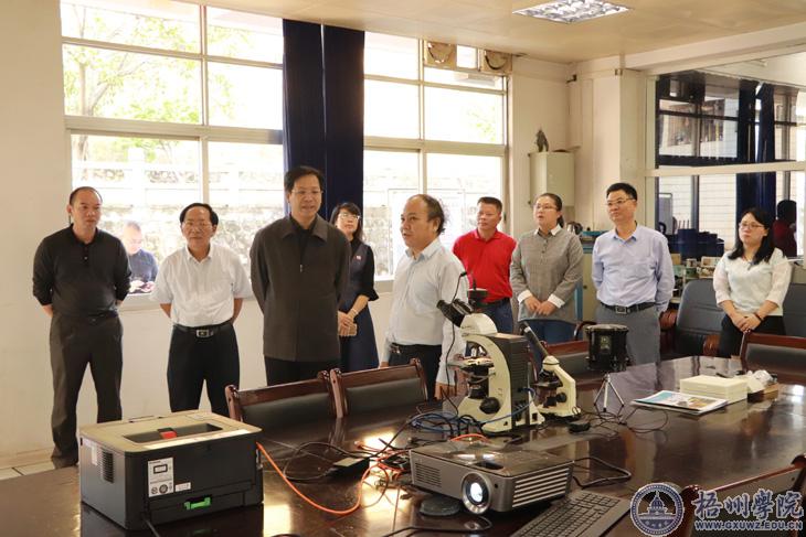 10月27日下午,自治区政协副主席、民盟自治区委主委刘慕仁来到我校,通过考察我校科研平台、召开座谈会听取汇报等方式,对我校发展情况进行调研。梧州市政协副主席、民盟梧州市委主委韦宁,学校领导玉振明、邱房贵、甘金明陪同调研。