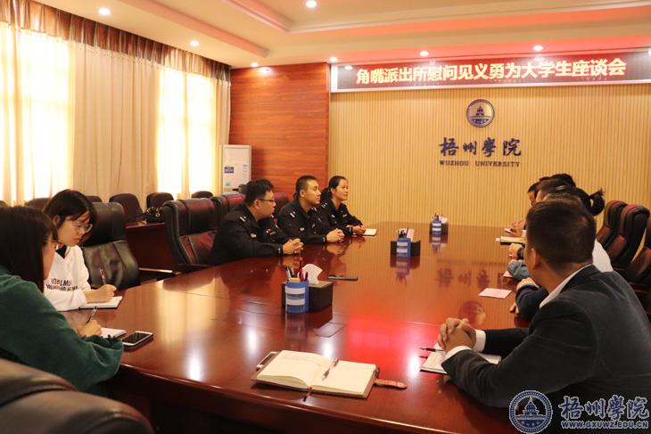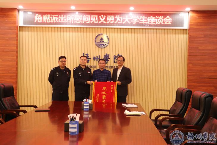 11月14日上午,梧州市公安局角嘴派出所教导员易智一行来到我校,慰问了我校见义勇为当街勇擒扒手的3名学生,送上慰问金,并给我校赠送“见义勇为”的锦旗。慰问座谈会在学校明理楼八楼第二会议室召开。3名见义勇为的学生,角嘴派出所民警,学校党委宣传部、学生工作部(处)、保卫处、商学院、大数据学院等单位负责人、相关科室人员参加座谈会。