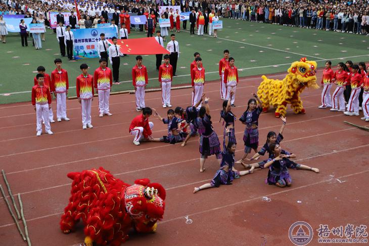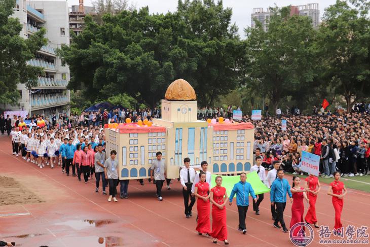开幕式上,各二级学院方块队精彩纷呈,既结合了二级学院的专业特色,又展现了现代科技元素;既有浓厚的中华民族气息,又有时尚的舞蹈元素。大数据软件工程学院学子手持“挑战自我,超越梦想”的标语,表达了他们在本次运动会中取得优异成绩的决心;马克思主义学院的学子身穿白色上衣,喊着“审问慎思,笃行致远”的嘹亮口号,展示着马克思主义学院学子的精神风貌和理想追求;教师教育学院的传统民族舞蹈,将力量与柔美相结合,是对中华传统文化的传承,也是对学校发展的美好祝愿;电子与信息工程学院的学子身穿蓝色上衣,尽情彰显着他们永不言弃、沉着稳重的体育精神;宝石与艺术设计学院展示的学校标志性建筑图书馆立体模型,利用旧废品制作完成,彰显了宝艺学子的环保、废物再利用的创新意识;外国语学院的学子们手持多国国旗,体现外国语学院的包容与融合;文学与传媒学院的方块队由女生组成,展现学院学子巾帼不让须眉的风姿;商学院将中国舞狮传统体育运动与整齐明快的竹竿舞相结合,展现商学院全体师生团结统一、共拼荣耀的精神风貌;法学与公共管理学院的方块队在一番井然有序的队列变化后,“FG”的阵型映入眼帘,呼应着法学与公共管理学院的缩写;机械与材料工程学院、化学工程与资源再利用学院的“海翼号”,激励着工科青年们,为实现中华民族伟大复兴的中国梦奋勇拼搏。