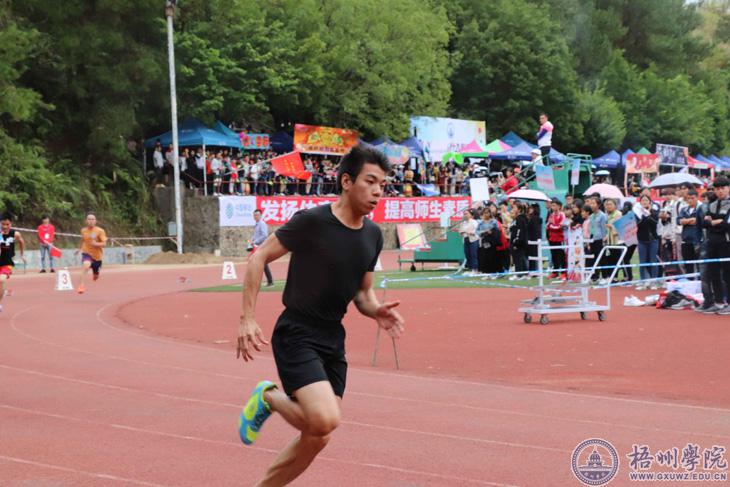 11月17日上午的跳远赛区内,决赛正在进行。在助跑时不断加速,用力一蹬,跳出一条弧线,在腾空的几秒里,脚蹬了几下,随后落地,谢武霖这第一跳便跳出5.68米的成绩。机化学院2017级机械设计制造及其自动化中升本班谢武霖是上一年男子跳远冠军获得者,今年,谢武霖参加了跳远、100米和4×100米接力赛三个项目,在跳远比赛中以5.68米获得第一。