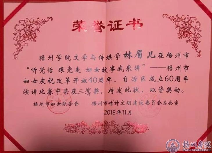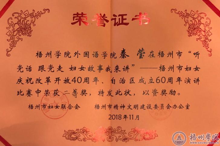 我校外国语学院教师秦莹、文学与传媒学院教师林眉儿在决赛中,从不同角度讲述了新时代梧州学院优秀女教师的故事,展现了她们各自的巾帼风采。秦莹老师获二等奖,林眉儿老师获得三等奖。