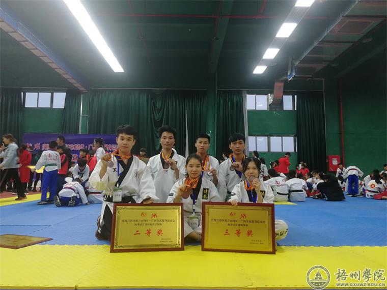 11月24日,广西全民健身运动会跆拳道比赛在梧州市综合体育馆二楼举行,我校跆拳道协会作为梧州市代表队之一出赛,参赛的项目为九人跆拳道舞蹈、个人品势和品势甲组男子团体,最终,为梧州市代表队拿下了品势甲组男子团体二等奖、跆拳道舞蹈三等奖的优异成绩。