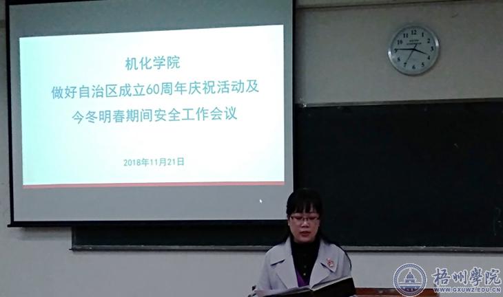 为确保自治区成立60周年庆祝活动及今冬明春期间我校安全生产形势稳定,11月21日下午,机化学院召开自治区成立60周年庆祝活动及今冬明春期间安全工作会议。机化学院领导、教研室主任、实验室主任、党政办副主任、辅导员和18级班主任参加了会议。
